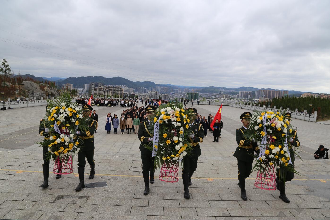 青松翠柏,长空流岚。学院全体师生党员与入党积极分子怀着无比崇敬的心情在吉首市烈士纪念碑前庄严肃立。在肃穆的《献花曲》中,以“中共beat365中文官方网站委员会”、“中共beat365中文官方网站委员会教工支部”、“中共beat365中文官方网站委员会学生支部”名义敬献的花篮被摆放在纪念碑基座上,院党委书记宋洁、院长丁建军、副院长龙海军集体上前整理花篮缎带。