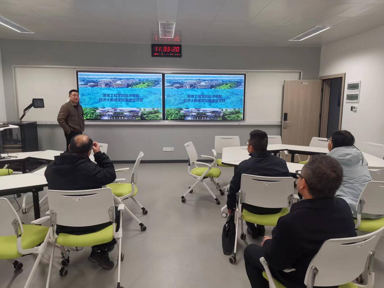 丁建军一行在两个学院领导的陪同下,参观了经济大数据实验室、经济统计实验室、经济管理基础实验中心、物流与供应链VR模拟实验室等实验实践教学场地。