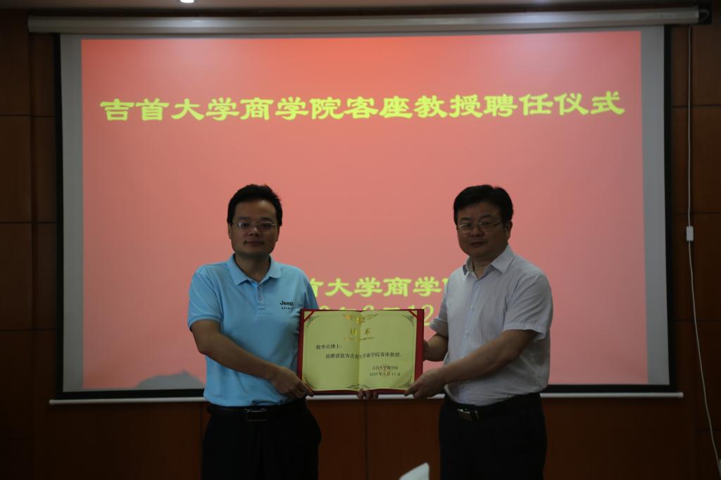 6月12日上午,学院在院会议室举行客座教授聘任仪式,聘任湘西经济开发区党工委委员、管委会副主任敬华兵博士为学院客座教授。湘西经济开发区党工委委员、管委会副主任皮丕军,湘西经济开发区文化教育和卫生局副局长向大海,beat365中文官方网站党委委员、副校长冷志明,院党委书记黎克双,院长丁建军参加了聘任仪式,仪式由副院长龙海军主持。
