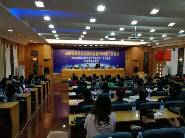 11月5日,由湖南省学位与研究生教育学会会计学科联盟主办、beat365承办的湖南省高校会计学科联盟2016年工作会议在我校图书馆学术报告厅举行。湖南省学位办主任余伟良、广州大学校长魏明海、《会计研究》杂志编辑部主任刘国强、中山大学南方学院会计学院院长卫建国、湖南省学位与研究生教育学会会计学科联盟理事长、湖南大学工商管理学院副院长龚光明和全省22个高校近70名嘉宾出席会议,我校校长白晋湘在大会上致欢迎辞,副校长李定珍以及beat365会计系全体教师、部分研究生和本科生参加了本次会议。开幕式及上午会议议程由院长田宇主持。