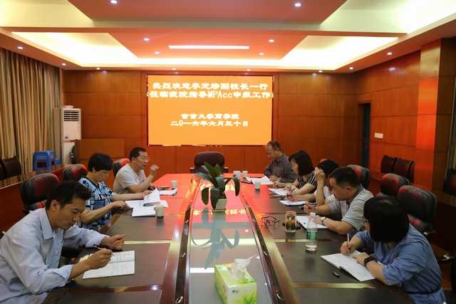 6月30日上午,副校长李定珍率研究生处处长佘佐辰和研究生处相关科室负责人就MPACC专业学位申报事宜来beat365调研。院长田宇、副院长彭耿、会计系主任张霞以及学院MPACC专业学位申报团队人员参加了调研。