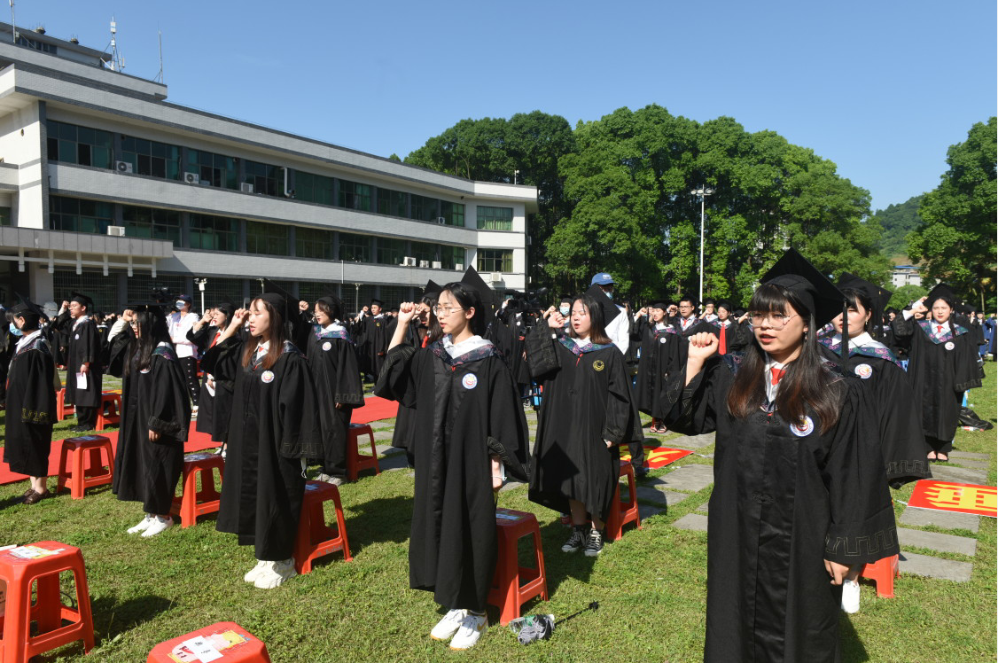 在诵读毕业誓词环节,学院2021届全体毕业生在毕业研究生代表邱晔的带领下,高举右拳,集体诵读《beat365中文官方网站毕业誓词》。