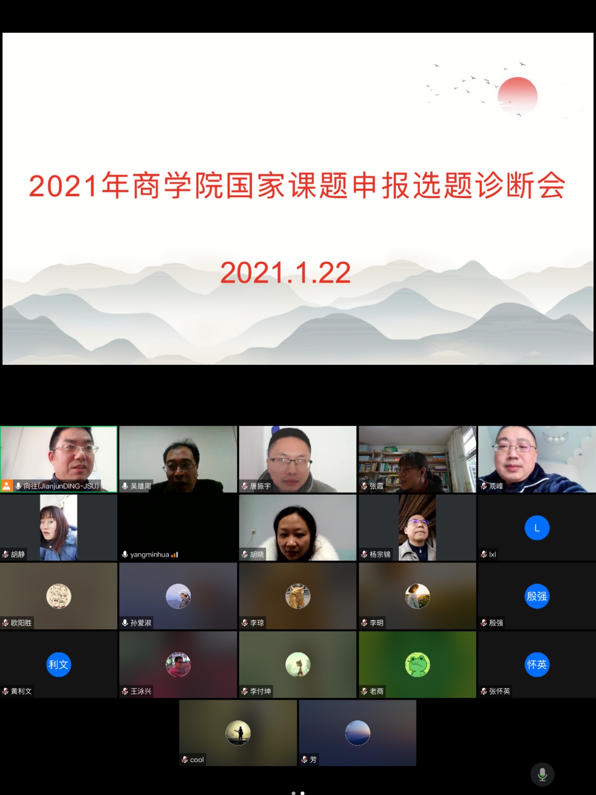 1月22日下午,学院以线上视频方式举行2021年国家课题申报选题诊断会,院长丁建军,学院2021年国家课题申报各指导小组组长张琰飞、龙海军、李琼、吴雄周、商兆奎以及2021年准备申报国家课题的所有老师参加了诊断会。