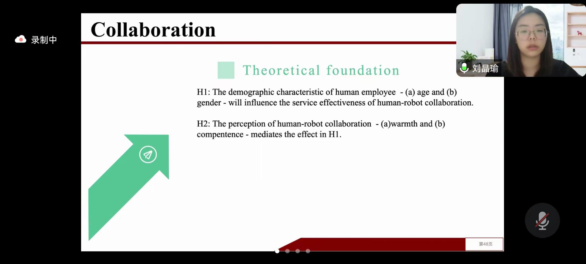 刘晶瑜博士在讲座中,首先向大家引入了劳工替代的假设:H1: Sensing contagion cues positively impacts customers ' adoption of service robots in hospitality service.H2:Customers’social avoidance tendency mediates the effect between sensing contagion cues and adoption of service robots in hospitality service。其次,刘晶瑜博士向大家提出了研究问题:Whether and how service robots can influence customers autonomous consumption behavior in hospitality and tourism service encounters?再次,刘晶瑜博士向大家阐释了Social impact theory:Individuals’ behaviors can be influenced by any real,implied and imagined presence or action of others。最后,刘晶瑜博士强调Theoretical foundation: Warmth: perceptions of others’ intention, Competence:perceptions of others capabilities。